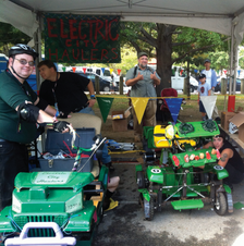 One of our first group projects is to convert a Barbie car, barely large enough for an adult to sit in, into "The Dragon", an electric race car which we race at the 2014 World Maker Faire in Queens. Our crack team of makers develops an innovative tilting steering mechanism for our car which allows it to take corners at high speed. But our innovation also makes the car difficult to handle. At one point during the race our driver slams into a curb and the severe blow damages the steering mechanism. During a pit stop Claire heroically borrows a neighboring makerspace’s flux-core arc welder and repairs the car! But we are critically behind in the race, barely limping along compared to the Michigan team which is repeatedly zooming past us at high speed around and around the little race track at the big faire. Claire’s son Casper steps up to the challenge. At the next pit stop he and his friends attach a kerosene-soaked rag to the Dragon’s tongue and light it on fire, and then they release the flaming Dragon back onto the track. The crowd goes wild with delight! My daughter Thea carries the Moxie board through the crowd and we quickly accumulate enough Moxie Points to take second place! Hurray for the Generator!