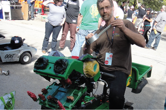 Personalities come and go, but the Generator persists. In the fall of 2015 a young man named Elliot Wells takes the helm as the Generator’s president. President Obama invites Elliot to come to the White House, and along with hundreds of other makerspace organizers, they all celebrate the maker movement together. The movement has moved into the mainstream. The Generator is becoming noticed as a force for positive change in our little town. That spring Elliot and I drink a little bit too much kava tea at the local kava bar and we share a joint vision of a large wheeled vehicle festooned with gyrating dancers and happy musicians rolling down the mainstreets of Ithaca. We obtain a grant from Ithaca’s Community Art Partnership to build such a vehicle, and so I weld together a big steel frame capable of supporting a crew of dancers and musicians. I purchase several Walmart fat bikes and use their wheels to support the frame. I call my vehicle the Mega-Wagon. I recruit dancers and musicians from my DJ friend Doug Shire’s weekly ecstatic Dance Church. That summer my Mega-Wagon makes an appearance in the Ithaca Festival Parade in front of an adoring crowd. My heart opens. I begin to notice a trend in my life, a predilection toward construction of decorative electric vehicles.